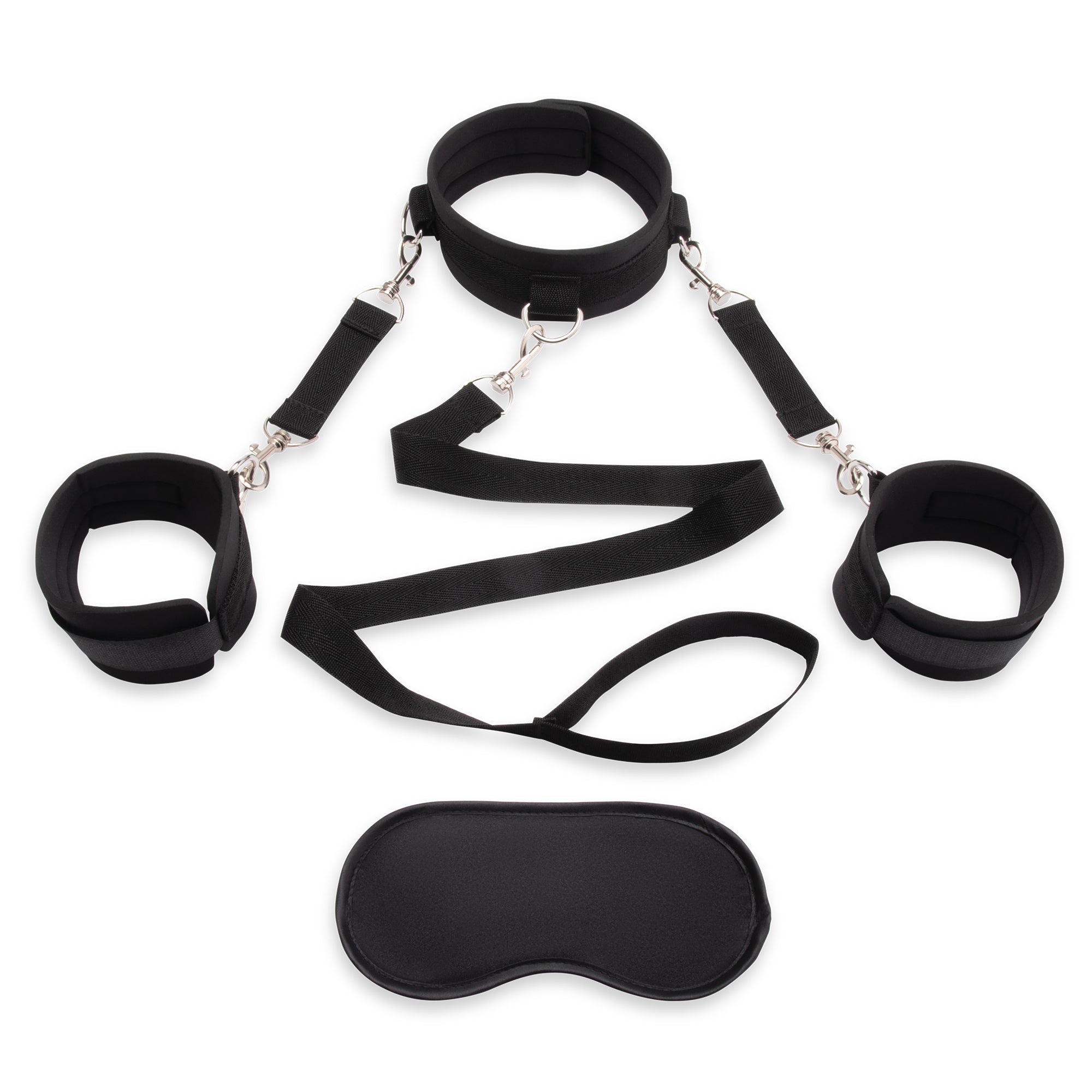 Start your intimate play journey with this versatile 4-piece set, perfect for beginners and experienced enthusiasts. Featuring a soft, adjustable collar with a neoprene inner lining, this set ensures maximum comfort for extended wear. The removable cuffs offer flexible play configurations, and the detachable leash (32½" / 83 cm) includes a quick-release safety clip for peace of mind. Complete with a satin blindfold, this set provides everything needed to explore roleplay and enhance sensory deprivation scenarios.
