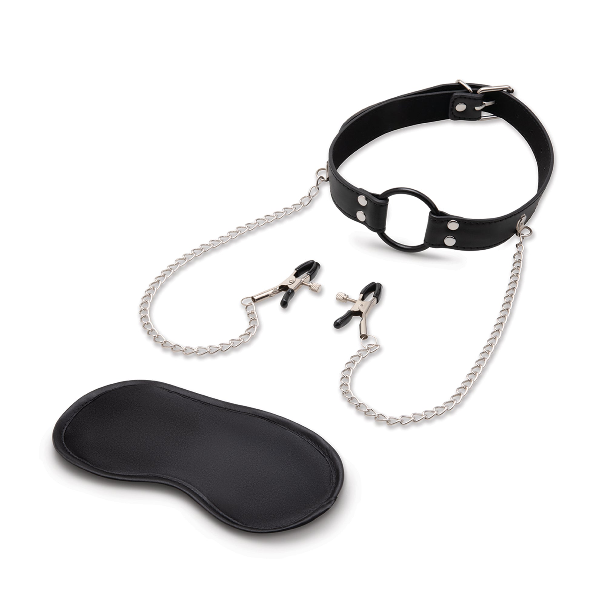 Experience safe and stylish restraint with this complete 3-piece sensory set. The breathable open mouth gag ensures comfort during prolonged sessions, while the adjustable clamps offer customized intensity for all experience levels. Designed with chic faux leather and durable, body-safe materials, stylish chains link the components for both visual appeal and secure linkage. The included satin blindfold heightens the overall sensory experience, blending aesthetic appeal with deep control and comfort.